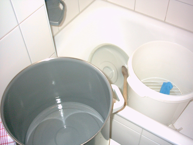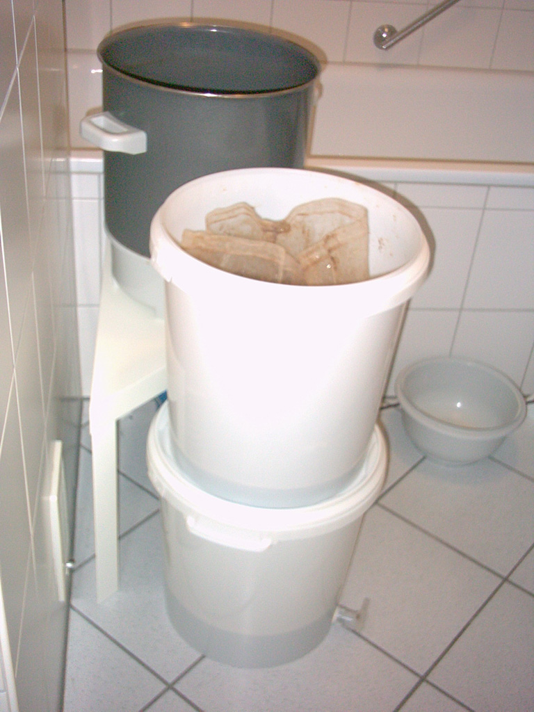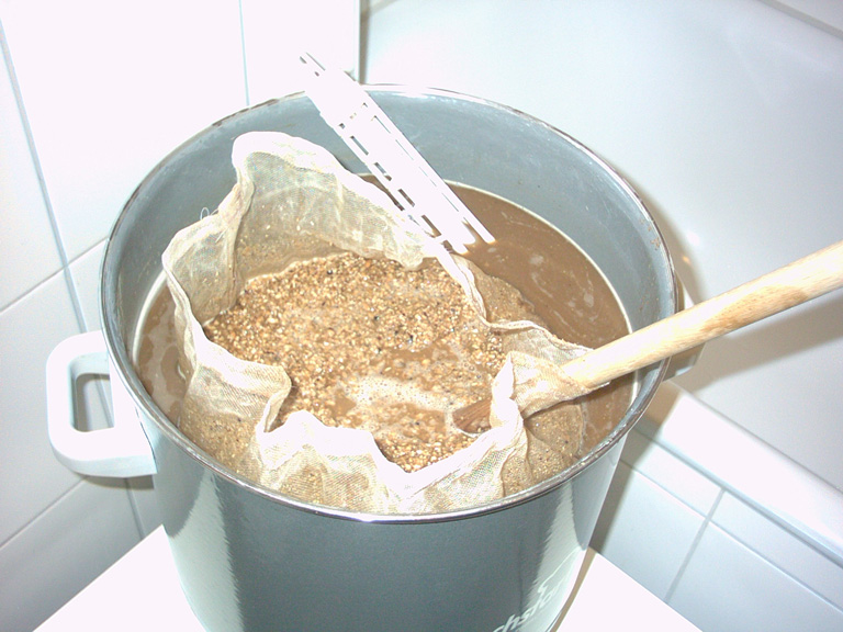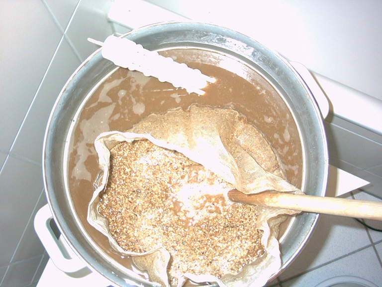 | ... das ganze wird dann in (je nach rezept unterschiedlich) erhitztes Wasser gegeben - es wird eingemaischt ... |