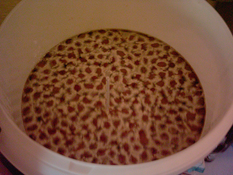 | ... erst dann, kann die Hefe dazugefügt werden, und nach wenigen Stunden sieht man sie ihren Dienst verrichten (hier sieht man ein Kirschbier - das helle ist die obergärige Hefe und die dunkleren Punkte sind Kirschen)...  |